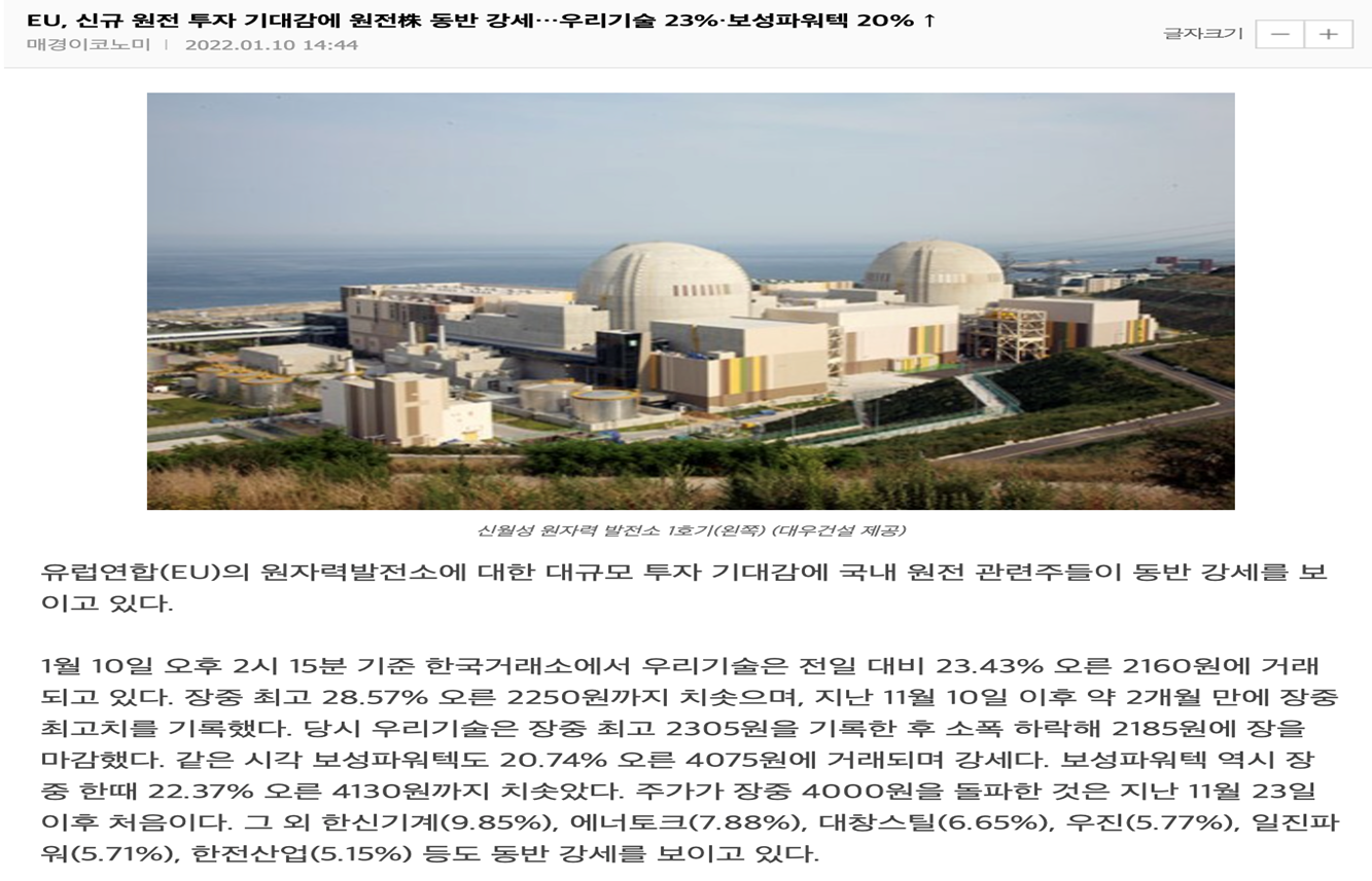 이 또한 마찬가지로 원전에 대한 신규투자의 기대감은 유럽쪽에서도 이미 그런 부분에 대한 내용이 나왔고, 원전 관련주에 대한 훈풍이 지속될 것으로 예상되기에 신규투자에 대한 기대감을 가지셔도 됩니다.