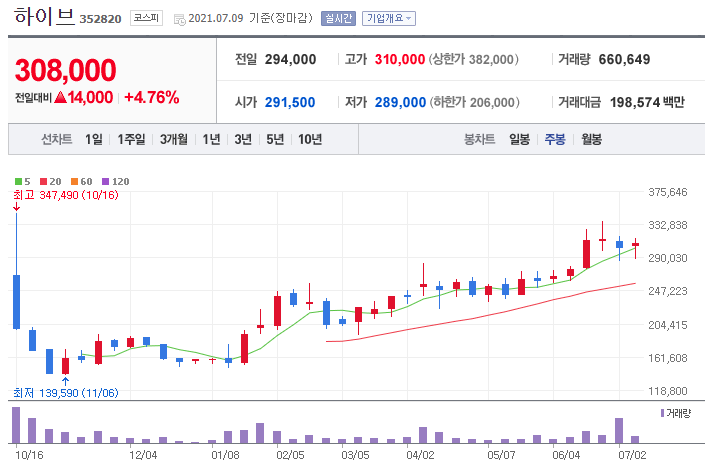 하이브 BTS는 최근 컴백을 하게 되었는데요, 컴백과 동시에 위버스 플랫폼 지분가치가 높아졌고 신곡인 Permission to Dance를 발표한 후 주당 30만 원으로 급등하였습니다.
