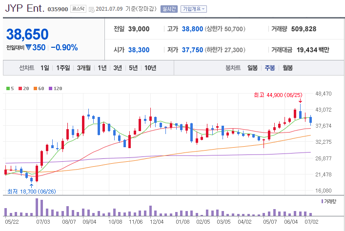 하지만 중국의 한한령 해제 움직임으로 작년 6월 30일 21,200원까지 치솟으며 기대감을 표시하였고 그 이후 올해 2월 17일에는 IT기업인 네이버의 지분투자로 음반 회사와 손을 잡으면서 종가인 36,450원까지 그리고 올해 6월에는 공연재개 기대 소식에 42,950원까지 올랐습니다.