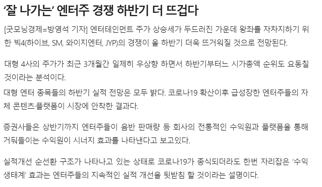 이상으로 엔터 관련주에 관해서 소개를 해드렸는데요, 소속사 가수의 역량과 앨범 판매실적으로 주가가 결정되는 만큼 향후 하반기 오프라인 무대 재개에 촉각을 곤두세우면서 추세를 지켜보심이 좋을 것 같습니다.