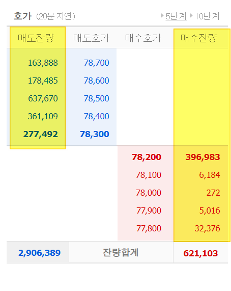 잔량을 살펴보면 매도는 78500원에 제일 많은 물량을 보유하고 있는 것을 볼 수 있고 매수는 78200원에 잔량이 많이 확보되어 있는 것을 알 수 있죠.