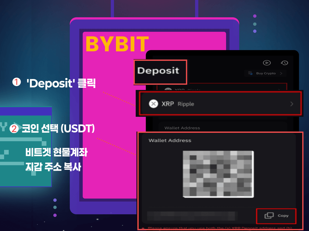 코인과 네트워크 설정이 끝나면 입금 지갑 주소와 QR코드가 생성되며, 주소 옆에 있는 'Copy' 아이콘을 클릭하여 복사를 해줍니다.