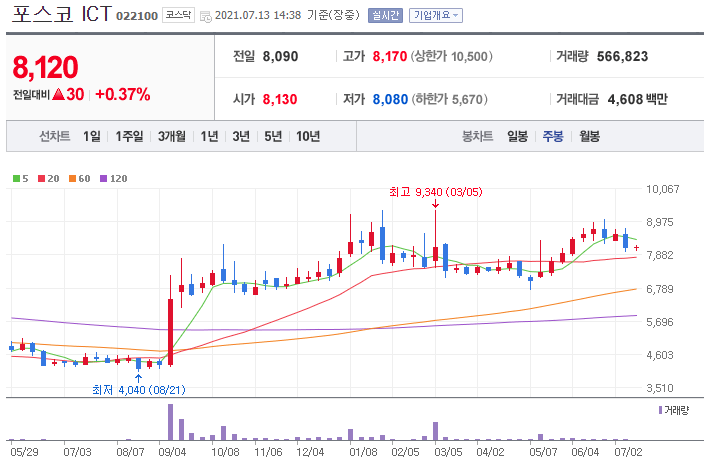 포스코ICT 2020년 8월 20일 저점인 4,065원에 머물고 있었던 상황에서 대전 물류 화 사업 1,070억을 수주하였다는 이유와 9월 8일 자산운용사 RPA확산을 하였다는 이유로 10월 13일까지 7,810원까지 오르고 한차례 조정을 받아 6,940원까지 떨어졌습니다.