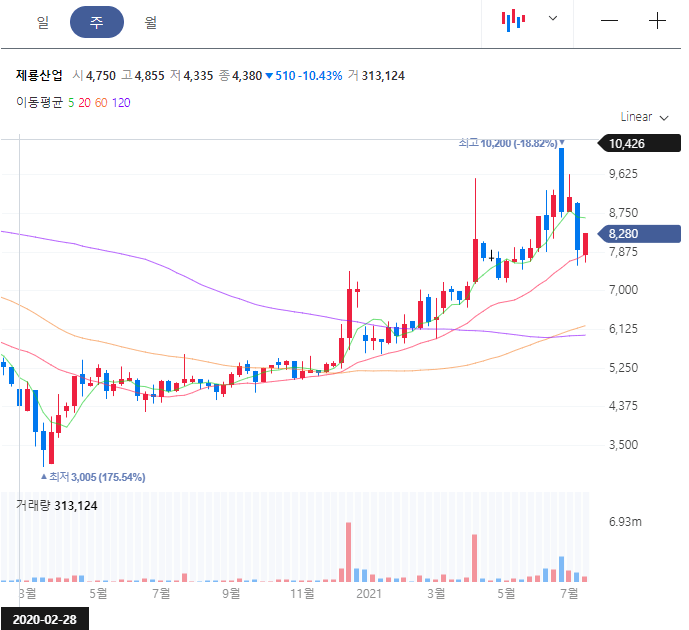 제룡산업 주가는 총 3번의 포인트를 잡고 이야기 드릴 수 있는데 추미애 전 법무장관과 얽힌 것은 2020년 12월 17일 이었는데요 이때 5730원에서 6730원까지 거래량이 증가하게 되었고 이후 재료가 떨어져 큰 폭으로 주저 앉았습니다.