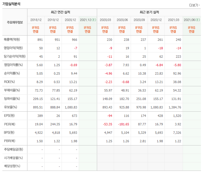 1분기 영업이익 역시 11억원의 손실을 기록하고 있고 순이익율이 200% 손실을 입고 있는 것으로 보아 판매부진이 여전히 이어지고 있는 상황이고 판관비 부담 역시 가중되고 있는 상황이라고 분석해볼 수 있습니다.
