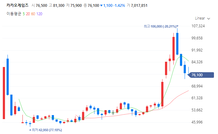 카카오게임즈 주가는 작년 9월 11일 상장직후 따상에 성공하며 81100원에 안착하였지만 곧 차악실현의 움직임으로 조정을 받아 42950원대까지 떨어졌습니다.
