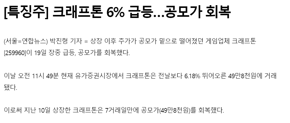 크래프톤의 진가가 다시 발휘되는 것일까 모든 사람들의 궁금증을 자아내는 가운데 오늘 소식으로는 공모가를 회복하며 안정적인 추세를 보여주고 있습니다.