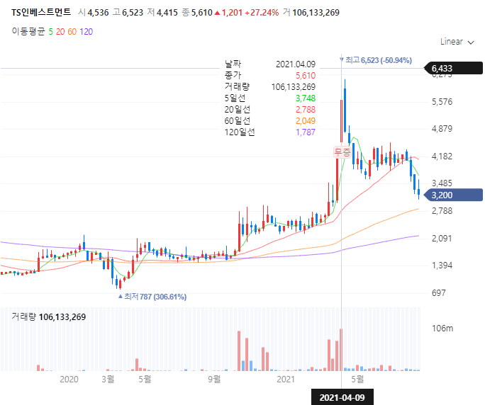 TS인베스트먼트 주가는 올해 4월 2일 가상화폐거래소인 두나무에 투자를 했다는 소식에 29% 상승한 4409원에 마감을 한바 있으며 이후 4월 9일까지 총 6523원인 52주 최고가 경신을 하였습니다.