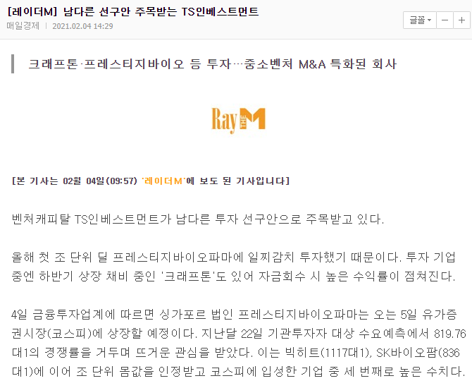 크래프트 관련주 TS인베스트먼트는 중소기업창업투자회사이자 중소벤처 M&A펀드를 결성할만큼 이 분야의 전문성이 있습니다.