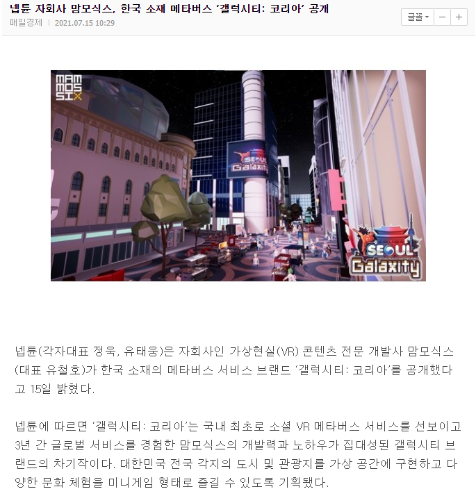 그리고 현재 메타버스 관련 종목으로도 분류가 되어 있는 자회사인 맘모식스가 한국소재 메타버스 게임인 갤럭시티: 코리아를 출시함으로써 향후 행보를 지켜봐도 좋을 것 같습니다.