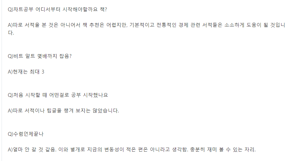 그리고 차트 서적 등 공부를 하는 것보다 소액으로라도 매매 경험을 쌓는 것이 중요하다고 했고 보조지표는 이용하지 않는편으로 캔들과 거래량만을 집중한다고 했는데요.