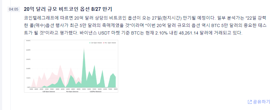 아마존 결제가 사실무근으로 밝혀졌음에도 비트코인 시세가 단기간 50k를 돌파할 수 있었던 이유는 다양한 이유가 있겠지만 그중에서도 8월 27일 20억 달러 규모의 옵션이 만기가 예정되었기 때문으로 보이는데요
