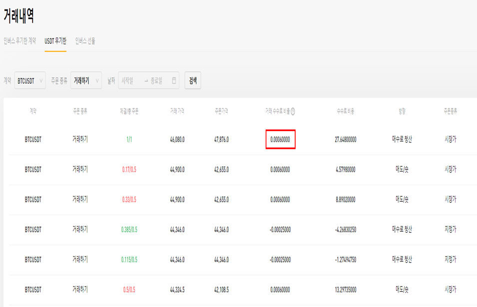 만약 바이비트 수수료 20% 혜택이 적용됐는지를 확인하기 위해서는 1USD로 시장가 거래를 한 후 우측 상단의 주문 및 거래 - 거래내역에서 수수료 비율을 확인했을 때 0.00075%라면 적용받지 못한 것이고 0.0006%라면 20% 혜택을 받고 있는 것이니 거래 후 확인해보시길 바래요!