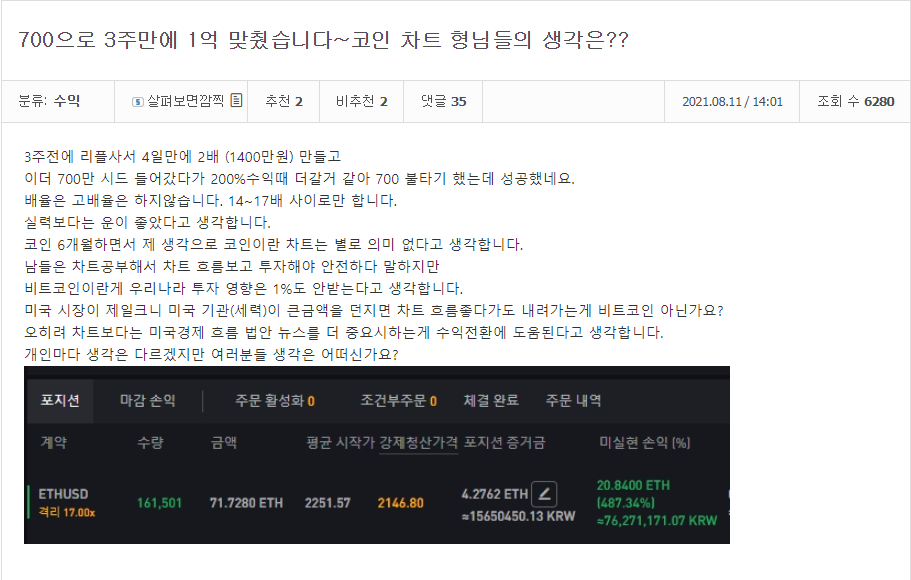 해당 후기를 보면 700만원으로 3주만에 1억원의 수익을 만들었고 매매 방법은 14~17배의 레버리지로 단타 위주의 거래를 했다고 하는데요.