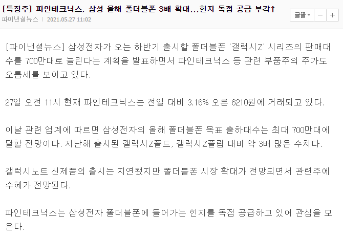삼성전자의 스마트폰 판매량을 살펴보면 폴더블이 70%를 차지할 정도로 높은 수준을 유지하고 있는데요, 보통때는 여성들이 아이폰으로 많이 가곤 했는데 요새는 Z플립으로 신규진입하는 유저들이 늘고 있는 만큼 힌지 독점 공급하는 파인테크닉스의 전망은 하반기까지는 전망이 밝다라고 이야기 할 수 있을 것 같습니다.
