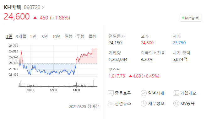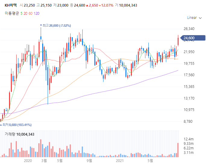 KH바텍 주가는 3월 20일부터 꾸준하게 우상향을 하던 도중 8월 7일에는 그렇다할 실적이 눈에 띄지 않아 20300원의 내림세에 올라탔으나 이후 28일 21일만에 폴더블과 연관 종목으로써 실적이 증가되어 주목을 받은바 있습니다.