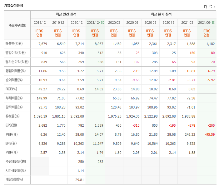비에이치 재무제표도 그리 나쁜 상황은 아닙니다. 우선 영업이익과 당기순이익이 모두 흑자세이며 매출액도 변이바이러스의 영향권 아래에 있는 상황에서도 7214억원의 매출액을 낸바 있습니다.