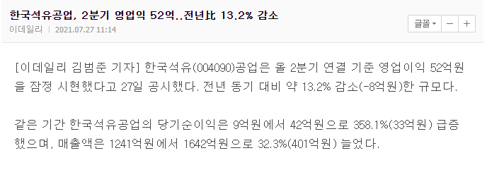 한국석유 재무제표는 비록 올해 2분기 실적은 나름 망쳤다고 볼수는 있지만 3년 연속 흑자를 기록하고 있는 것은 나름 고무적인 일이라고 생각해볼 수 있습니다.