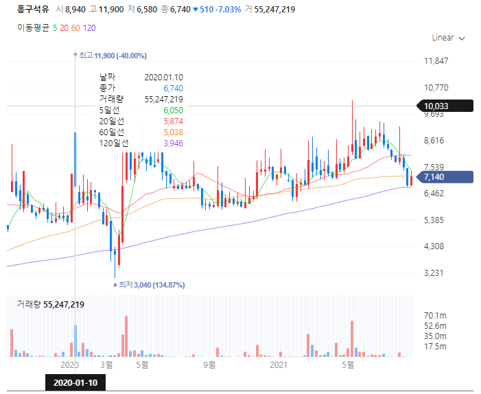 흥구석유 주가는 지난해 1월 10일 미국과 이란의 갈등으로 인해 고전을 면치 못하며 1월 10일 한때 11900원까지 올랐지만 6740원에 마감을 하였습니다.