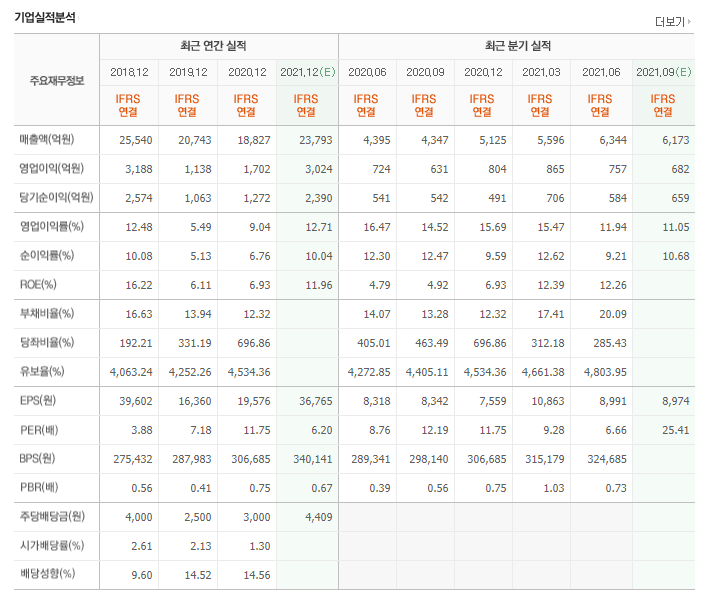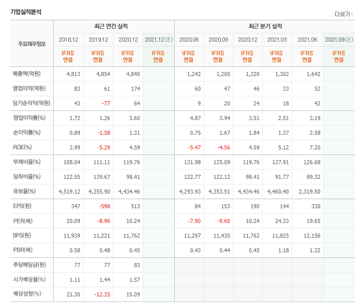 특히 작년 영업이익은 매출액이 전전년도보다 살짝 감소한 4840억원을 기록했지만 영업이익은 그 어느때보다도 높아진 174억원을 기록하였습니다.