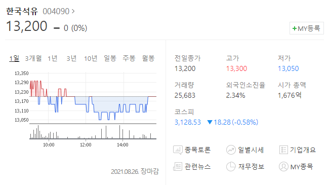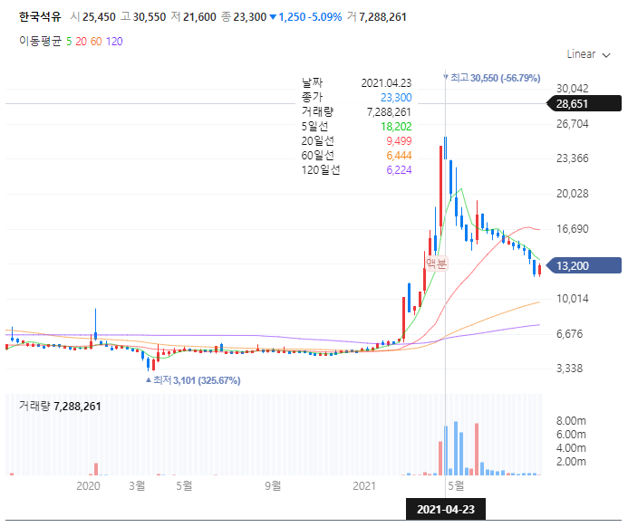 한국석유 주가는 코로나 이후에도 꾸준히 횡보를 지속하다 올해 4월 9일 액면분할을 실시한바 있으며 4월 16일까지 꾸준히 호재를 기록하며 16900원이던 주가는 24550원까지 훌쩍 뛰며 인기를 실감케 했습니다.