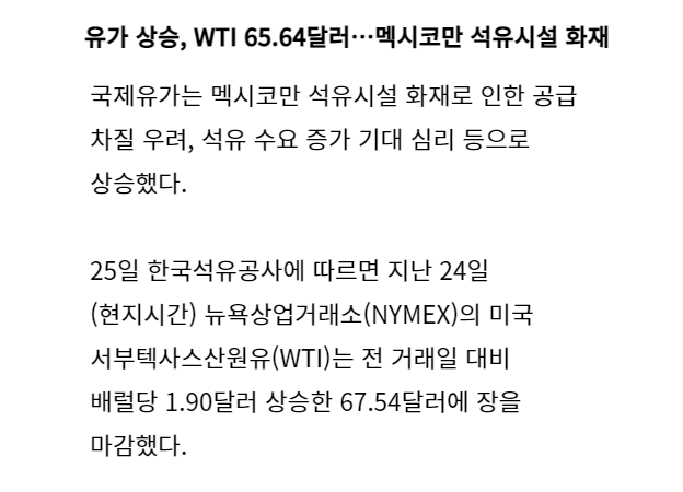 WTI 서부텍사스산원유 배럴당 1.9달러 상승하며 67.54달러에 마감을 하였습니다. 원유값이 상승하면서 석유를 생산하는 기업은 원가율 상승으로 인한 영업이익 축소로 울상이겠지만 반대로 석유를 가공해서 판매하는 기업은 값이 올라 영업이익이 확대되는 이점을 안게 되는데요.