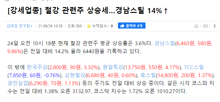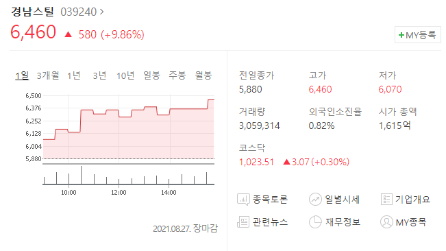 경남스틸 주가는 올해 4월 2일 철강재의 가격의 상승으로 매출이익이 늘어나리란 기대감에 26.7% 오른 3410원을 기록한바 있으며 이후 철강 원자재 가격 상승으로 인해 재료가 유지되었습니다.
