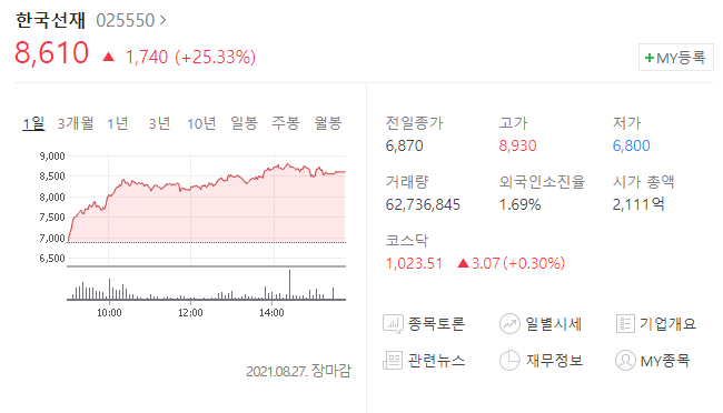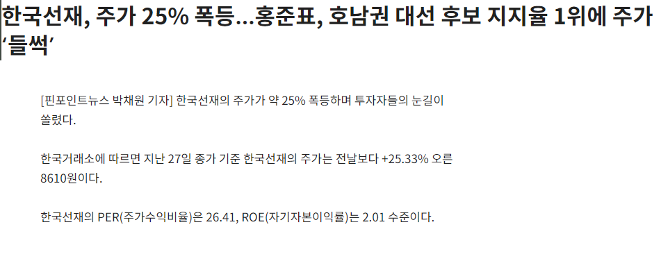 8월 13일 홍준표 대선출마선언으로 인해 관련주로 부각되며 36.14% 오른 5500원에 마감을 하였고 오름새는 꾸준히 유지되어 현재 6460원까지 오르게 되었습니다.