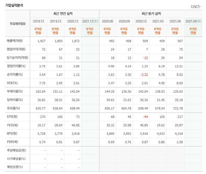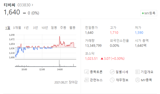 즉, 회사의 실적보다는 정치테마에 얽혀있어서 투기성 주가 오름세가 두드러지는 모양을 보이고 있으며 최근 8월 27일에는 홍준표 관련종목으로 묶여 62%가 한번에 오르게 되었는데 이로인해 투자주의 판정을 받은 상황이고 현재는 1640원에 머물고 있습니다.