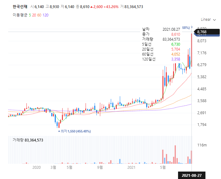 한국선재 주가는 코로나 발생 이후로 쭉 횡보를 하다 올해 5월 7일 원자재 가격이 상승한다는 기대감에 무려 45.6%나 오른 5440원에 마감을 한바 있습니다.