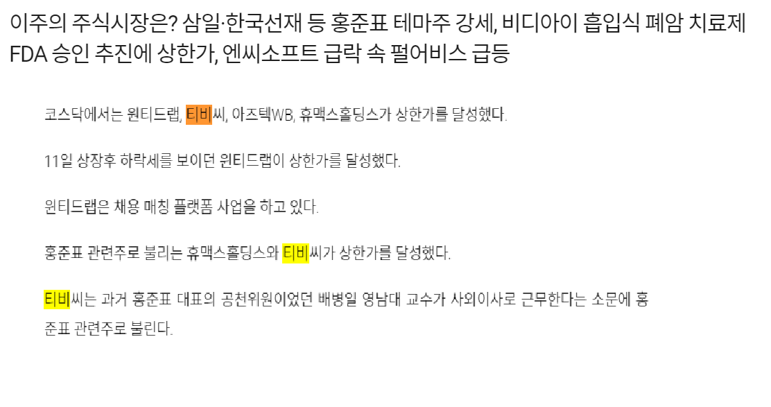 오늘은 홍준표 관련주인 한국선재 경남스틸 티비씨에 대해서 알아보았는데요, 마지막 종목의 결론에서 설명을 드렸듯이 상당수 급작스럽게 오른 종목이 대부분이라 장투에는 적합지 않다는 점을 아시고 투자에 유의하셨으면 좋겠습니다!