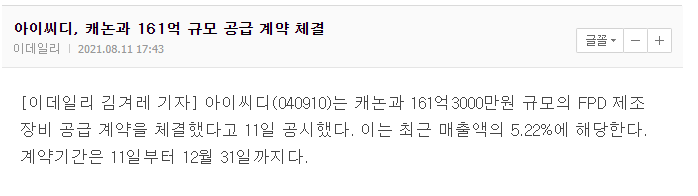 디스플레이 관련주 아이씨디는 LCD반도체 평판디스플레이의 장비 제조 사업을 목적으로 설립된 회사이며 현재는 아몰레드용 HDP 애처, CVD, 증착기, 증착전 애셔를 디스플레이 제조사에 공급하는 OLED 대장주로 꼽히고 있습니다.