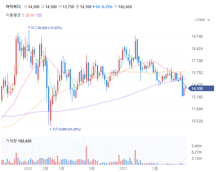 이후 더 나은 소식이 없다보니 점차 떨어져 60일선을 한창 내려간 14100원에 거래가 되고 있는 상황인데 바닥을 찾은것으로 보여 매수를 보시려면 지금이 타이밍일 것으로 판단합니다.