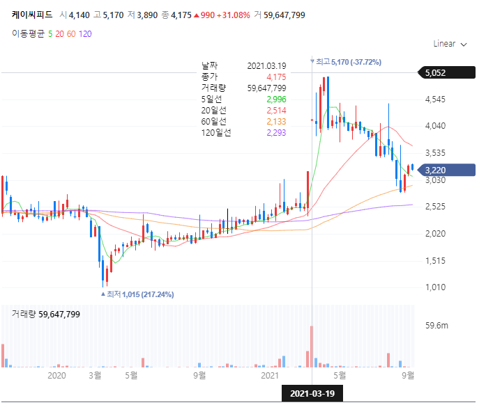 케이씨피드 주가는 마켓컬리 IPO가 추진의견이 본격화 되었던 3월 12일 가파르게 올라가며 19일에는 최고가인 5170원이라는 고점을 찍었으나 곧 조정을 받아 3200선에 머물었고 현재는 3220원에 안착해 있습니다.