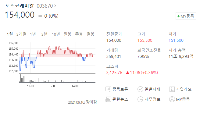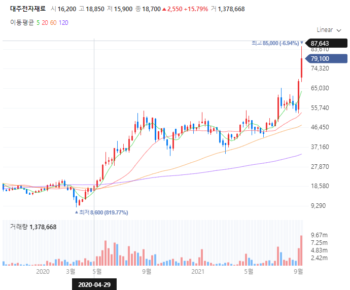 이후 가치를 인정받아 9월 3일부터는 2차전지 관련종목으로 주목을 받아 최고점인 85000원을 찍고 현재 79100원에 머물고 있습니다.