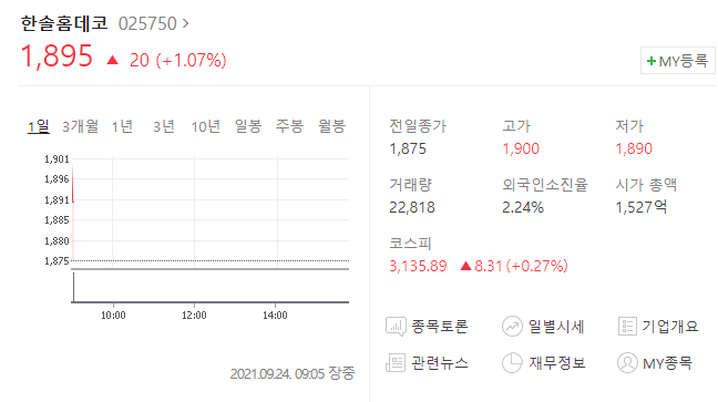 한솔홈데코 주가는 이평선보다는 급하게 오른면이 많이 있어 전체적으로 조정을 받아 내려오고 있는 양상을 보이고 있는데 작년 9월 11일에는 뉴딜 정책 탄소배출권 관련주로 묶이며 41%가량 오른 1575원에 마감을 한바 있습니다.