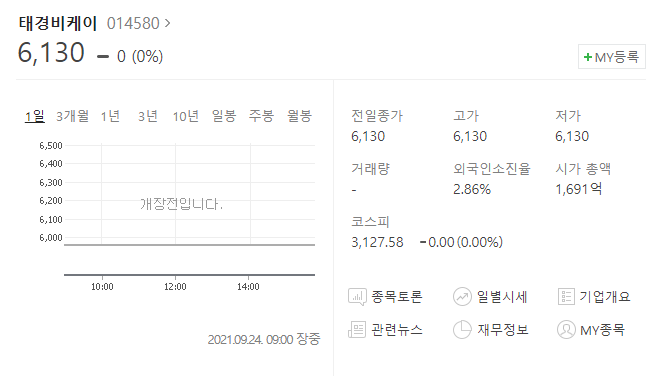 태경비케이 주가는 일정 수준으로 꾸준히 우상향 형태를 보여 성장주로써의 면모를 갖고 있으며 특히 올해 7월 30일 탄소중립 간담회 관련 기업으로 선정이 됨과 돼지열병 관련주로 분류되며 15.10%오른 6630원에 마감이 된바 있습니다.