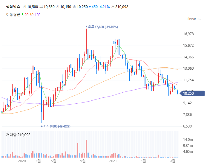 필옵틱스 주가는 하락세를 꾸준히 이어가는 가운데 현재 10250원에 머물고 있는 것을 볼 수 있습니다. 원인으로 지목되는 올해 1월 29일부터는 FMM 기술개발 국책과제에 선정이 되기는 했으나 경쟁사인 풍원정밀 기술력 경쟁싸움에서 밀려나며 탈락되었고 그 결과 16450원에서 14550 그리고 10250원에 이르기까지 꾸준한 내림세를 보여주고 있습니다.