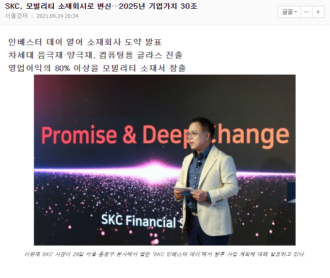 SKC 전망은 탄탄한 기반가운데 신소재의 확장을 시도하고 있는 것이라서 꽤나 여유로운 터닝포인트를 지나고 있는 것만 같습니다. 즉, 현재의 가치는 사실 조금은 저평가되었다고 해도 과언이 아닐정도로 재료가 많이 남아 있습니다.