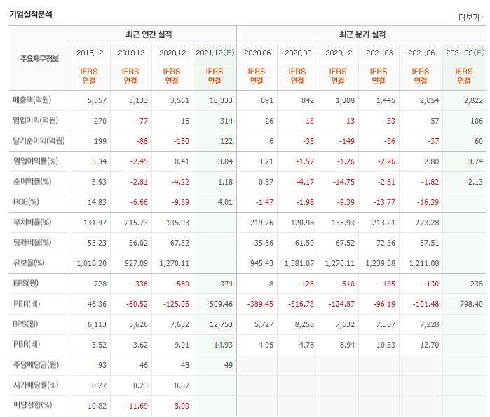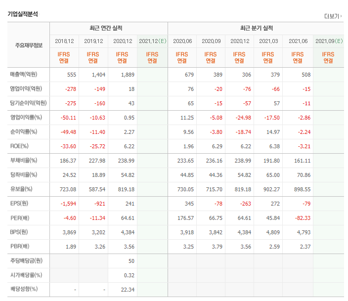 필옵틱스 재무제표는 작년 매출액이 1899억원 영업이익 18억원 2년만에 처음으로 흑자태세 전환을 하였습니다. 하지만 올해 2분기 실적을 보면 매출액 508억원 영업이익 15억원의 적자를 보면서 재무구조가 상당히 악화되어 있는 것을 볼 수 있는데요.