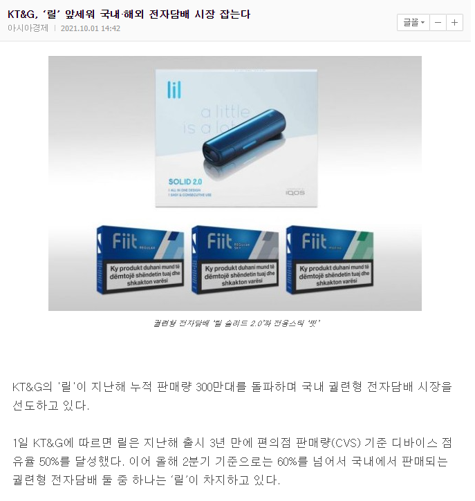 전자담배와 경쟁하고 있는 이 상황에서도 궐련형 전자담배는 꾸준한 인기를 끌고 있는 상황으로 최근 릴이 누적 판매량 300만대를 돌파하면서 해외시장을 잡기 위한 노력을 기울이고 있는 가운데 배당기준일은 12월 31일이며 배당락일은 12월 28일이므로 이 안에 구매를 하셔야 합니다.