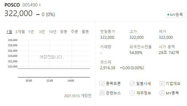포스코 주가는 꾸준히 우상향을 거듭하던 중 현재는 반등의 기회만 엿보고 있는 상황으로 작년 12월 4일 아르헨티나 소금호수인수건에 대해 2차전지 사업기대감에 10.86% 오른 265500원을 시작으로 올해 5월 14일에는 최고점인 413500원까지 상승했습니다.