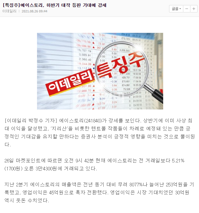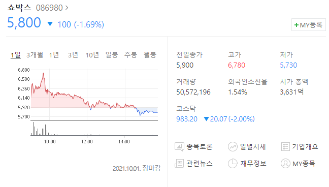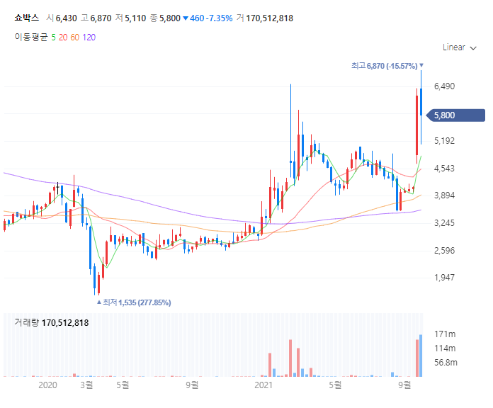 최근 9월 24일 오징어게임 관련주로 부각되면서 52.68%오른 6260원을 기록한 것을 시작으로 10월 1일 6870원 고점을 달성했습니다.
