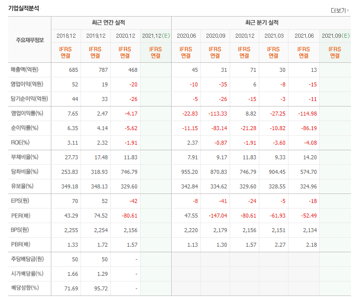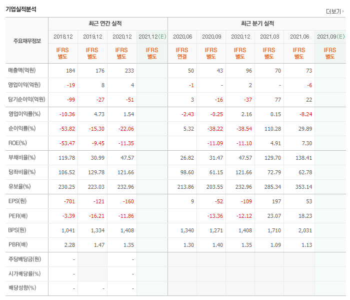 만일 성장주였다면 매출액과 영업이익이 꾸준히 나와야 했으나 작년 233억원의 매출 4억원의 영업이익을 기록하며 적자와 흑자와의 아슬아슬한 줄타기를 하고 있습니다.