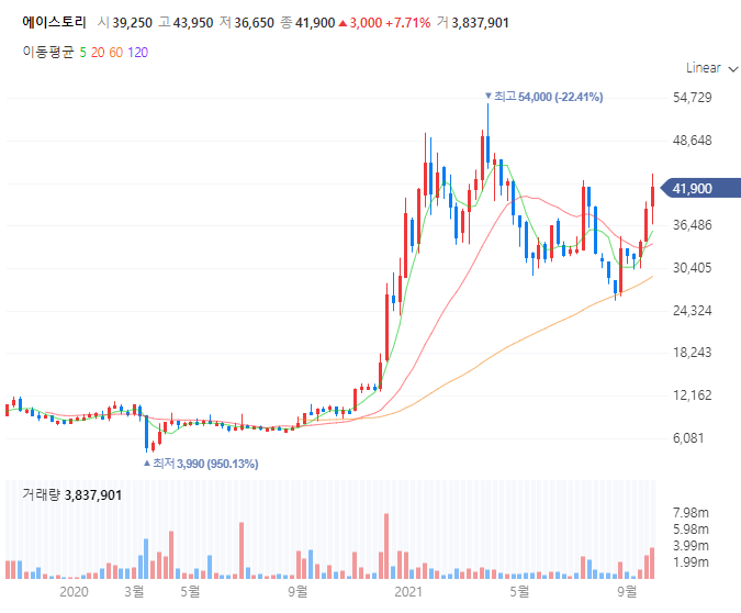 에이스토리 주가는 작년 12월 11일 지리산이라는 드라마를 출시하며 58.33% 오른 26600원에 마감하였고 올해 4월 2일에는 최고가인 54000원까지 상승 했습니다.