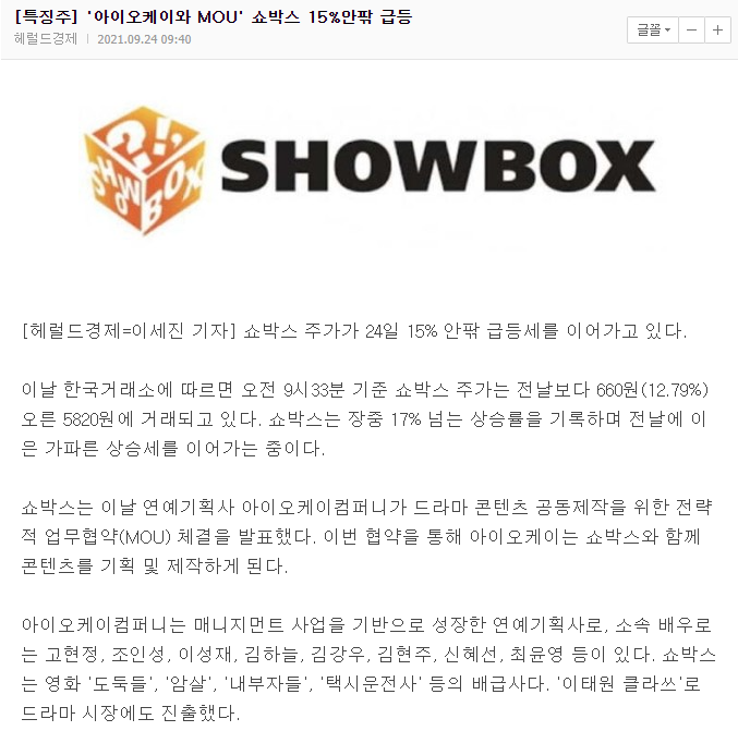 오늘은 오징어게임 관련주인 버킷스튜디오 쇼박스 에이스토리에 대해 알아보았는데요.