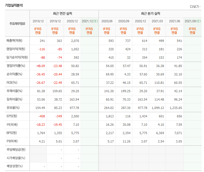 바이오니아 재무제표는 2020년 매출 기준 2070억원으로 2019년 363억원보다 훨씬 높은 수치를 기록하고 있으며 올해 1분기와 2분기 시장을 견주어 살펴보았을때 지난해와 비슷한 수준의 매출액이 나올 것으로 분석합니다.