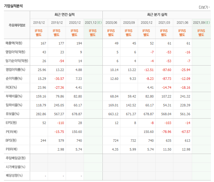 한국비엔씨 재무제표를 살펴보면 현재 주가가 너무 터무니 없다라는 것을 알 수 있는데 매출액이 작년 194억원에 올해 1분기 2분기 영업이익 적자를 보고 있는 상황입니다.