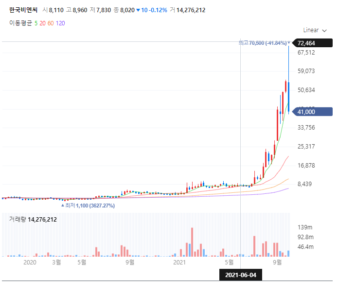 한국비엔씨 주가는 올해 9월 3일 코로나 치료제 관련주에 들면서 60.58% 상승한 41750원에 마감을 한바 있으며 이후로 10월 1일까지 70500원 최고점을 찍은바 있으나 이후로 장 후반 매도세가 커진 뒤 41000원에 머물고 있습니다.