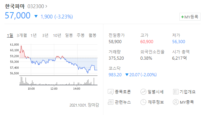 한국파마 주가는 올해 1월 15일 백신접종 경기부양책 발표로 인한 기대감에 23850원에서 126%상승한 53900원을 시작으로 현재 57000원대에 머물며 지속해서 5만 주가를 유지하고 있습니다.